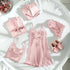 Featuring five components - a camisole, sleep shorts, pajama pants, a satin nightgown, and a robe - our pajama set is the epitome of sophistication. Delicate lace trim adds a playful touch to the radiant satin, harmonizing perfectly with the elegant design of each color option.