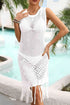 • The Linnie Openwork Cover-up Dress is a true summer staple, perfect for making a statement by the pool or at a sun-drenched brunch. The intricate, geometric crochet pattern offers a modern take on classic knitwear, while the playful fringe detail at the hem adds a touch of bohemian charm. Its sleeveless design and scoop neckline create a flattering silhouette, making it both elegant and comfortable for warm weather wear. Accessorize it with your favorite sunglasses and sandals for a look that's effortlessly chic and resort-ready.